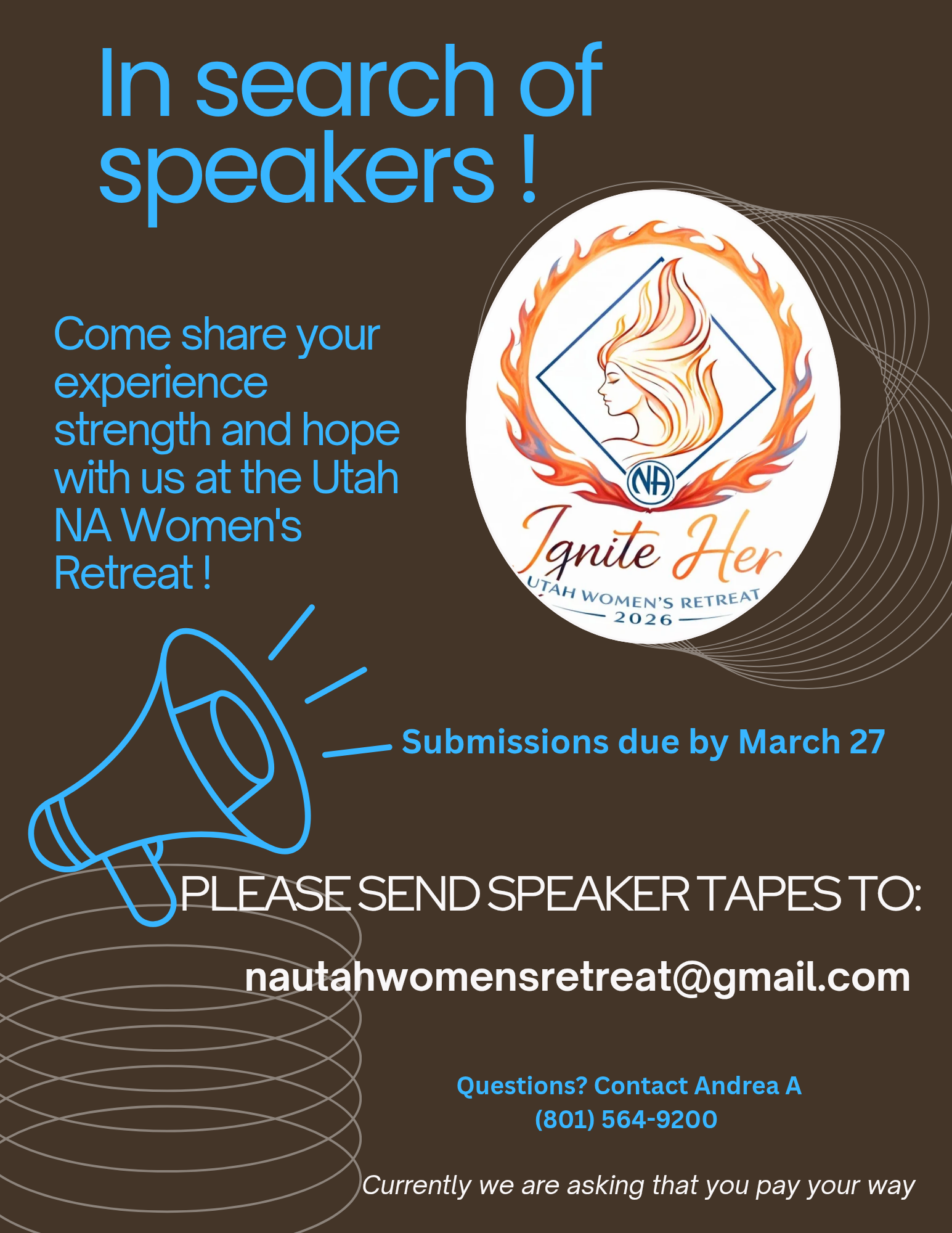 - Submissions for Speakers is OPEN through March 27th! Contact nautahwomensretreat@gmail.com to send your speaker tape for consideration. View the flyer for the speaker search.
